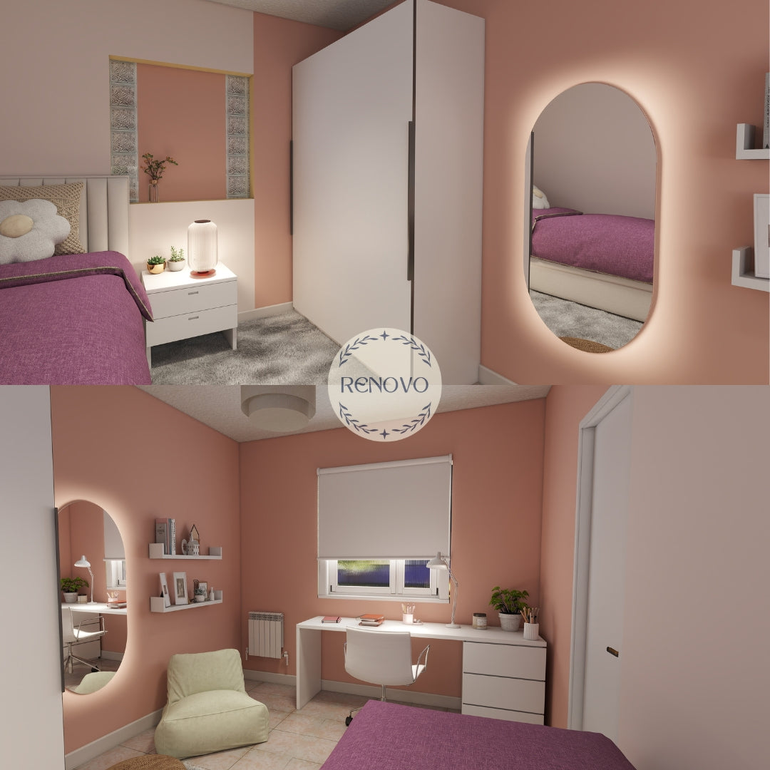 Este dormitorio juvenil cuenta con un rincón de lectura acogedor, un amplio escritorio con guardado para su creatividad y estudio, con un entorno que invita a enfocarse. El armario blanco aporta brillo y un espejo con iluminación LED para generar una atmosfera, cerca unos estantes ofrecen soluciones cancheras de almacenamiento para productos diarios. La cortina blackout asegura el descanso, y una gran alfombra con personalidad sobre piso cerámico combina calidez con fácil limpieza.