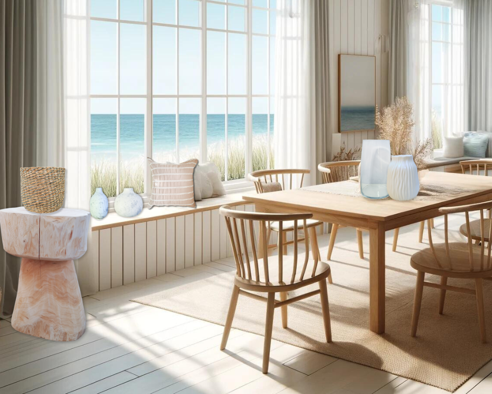 Inspirado en la playa y el océano, el estilo costero utiliza colores como azules, blancos y neutros claros. Materiales como la madera blanqueada y las telas ligeras ayudan a crear un ambiente relajado y fresco.